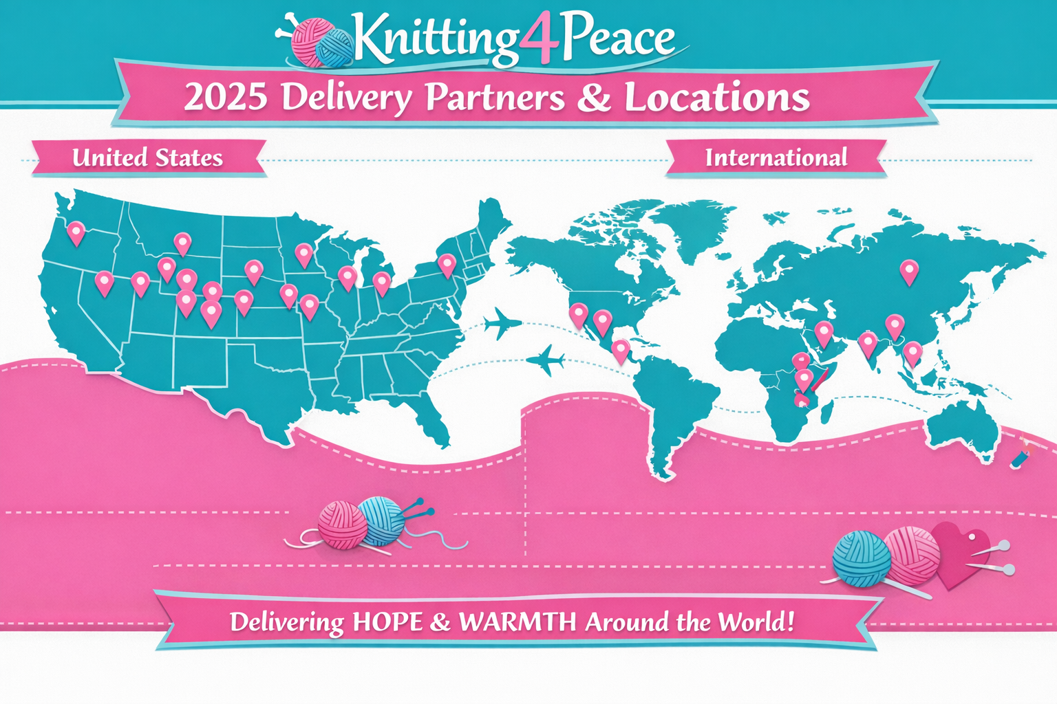 As we continue to celebrate our 20th anniversary year, I want to take a moment to honor the incredible impact we made together last year. Thanks to our dedicated makers, donors, Peace Makers, and volunteers, Knitting4Peace delivered thousands of handmade items of warmth and dignity to communities near and far. In 2025, our deliveries reached over 50 partners across the U.S.—from local elementary schools and hospitals to shelters and family support programs. Some highlights include: