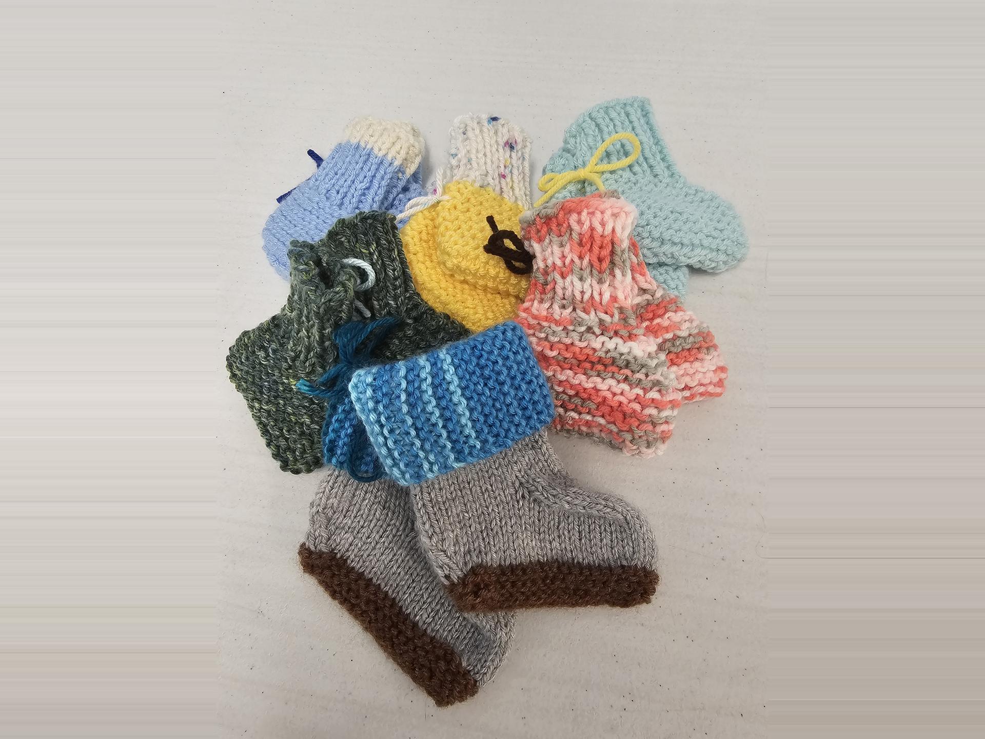 Large baby blankets are more flexibly sized, ranging from 30”-52”. These are requested by several different programs. Small and large baby blankets may be knitted, crocheted, or quilted. Infant hats must have a circumference of 13” or larger. This means that they must be 6.5” in diameter. Hats up to 18” circumference (9” diameter) are worn by children younger than age 3. We love seeing all the fun colors and yarns you use! However, the smallest sized hats are best made with soft yarns. Booties should be 3”- 4” from heel to toe and may be made with any soft and washable yarn. Please use a piece of yarn to tie pairs together. Do not use safety pins as these must be removed. Animal hair and strong scents can be a health risk, especially for infants and young children so please make sure there are no hairs or scents on any item you send us. |